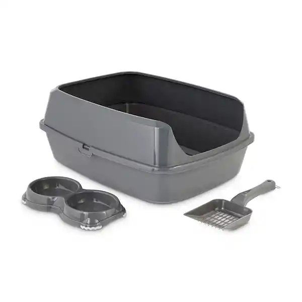 Incluye los elementos esenciales que necesita para que tu gatito se acomode agradablemente en su nuevo hogar. Este kit incluye un arenero resistente y fácil de limpiar con un borde para evitar que el gato saque arena, una pala para limpiar y un plato doble.