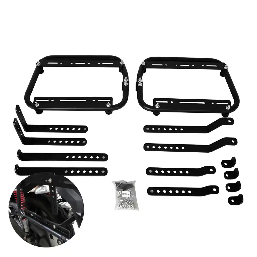Soporte Anclaje Maletas Laterales Aluminio Negro Motos Kit Universal Mejora la seguridad y capacidad de carga de tu moto con este soporte lateral universal para alforjas y baúles. Fabricado en aleación de aluminio de alta resistencia, es la solución ideal para quienes buscan durabilidad, estabilidad y un diseño elegante. Construido con placa de aleación de aluminio reforzada, este soporte aumenta la capacidad de carga de tu motocicleta. Su acabado en color negro aporta un look moderno y profesional, además de ser: - Anticaídas - Resistente al desgaste - De larga vida útil El soporte lateral está diseñado para sujetar firmemente los baúles o cajas laterales, evitando que se desplacen o se introduzcan en la rueda trasera. - Aumenta la estabilidad - Refuerza la parte trasera de la moto - Reduce riesgos durante la conducción Compatible con la mayoría de las motocicletas del mercado chileno (no apto para scooters ni motos con cajas ocultas). Compatible con baúles laterales rígidos de: 25L, 28L, 35L, 38L. Instalación Rápida y Sin Modificaciones. No necesitas realizar perforaciones, cortes ni modificaciones en tu motocicleta. Incluye: - Soporte izquierdo - Soporte derecho - Tornillos de montaje - Kit completo de accesorios de instalación Instalación simple y directa (revisar video de referencia). Además de soportar alforjas o baúles laterales, este sistema ofrece mayor espacio para transportar equipaje, herramientas o artículos personales. También brinda un punto de apoyo adicional que mejora la seguridad del pasajero trasero. Especificaciones Técnicas: - Material: Aleación de aluminio - Color: Negro - Capacidad compatible: 25L, 28L, 35L y 38L - Compatibilidad: Apto para la mayoría de motocicletas - Contenido de paquete: Soporte lateral universal para baúl de motocicleta
