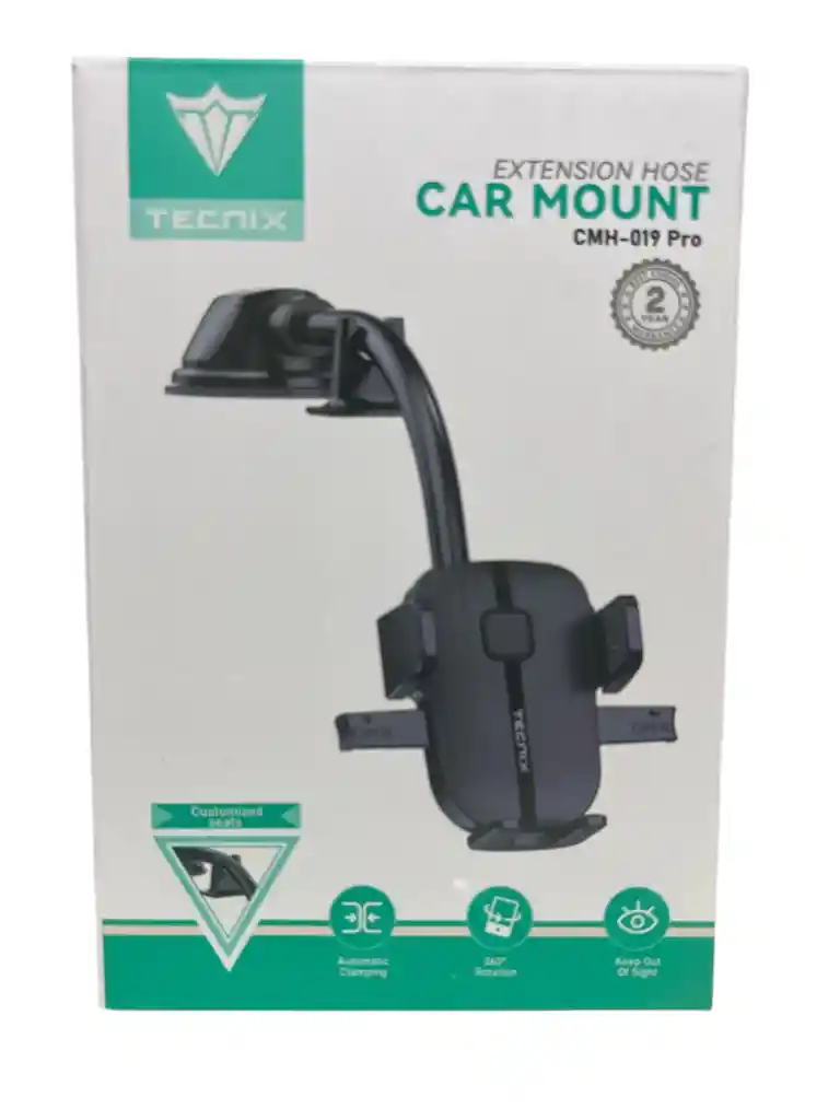 Soporte con brazo ajustable y rotación de 360°. Incluye ventosa de alta succión y sistema de sujeción automática para máxima seguridad al conducir.