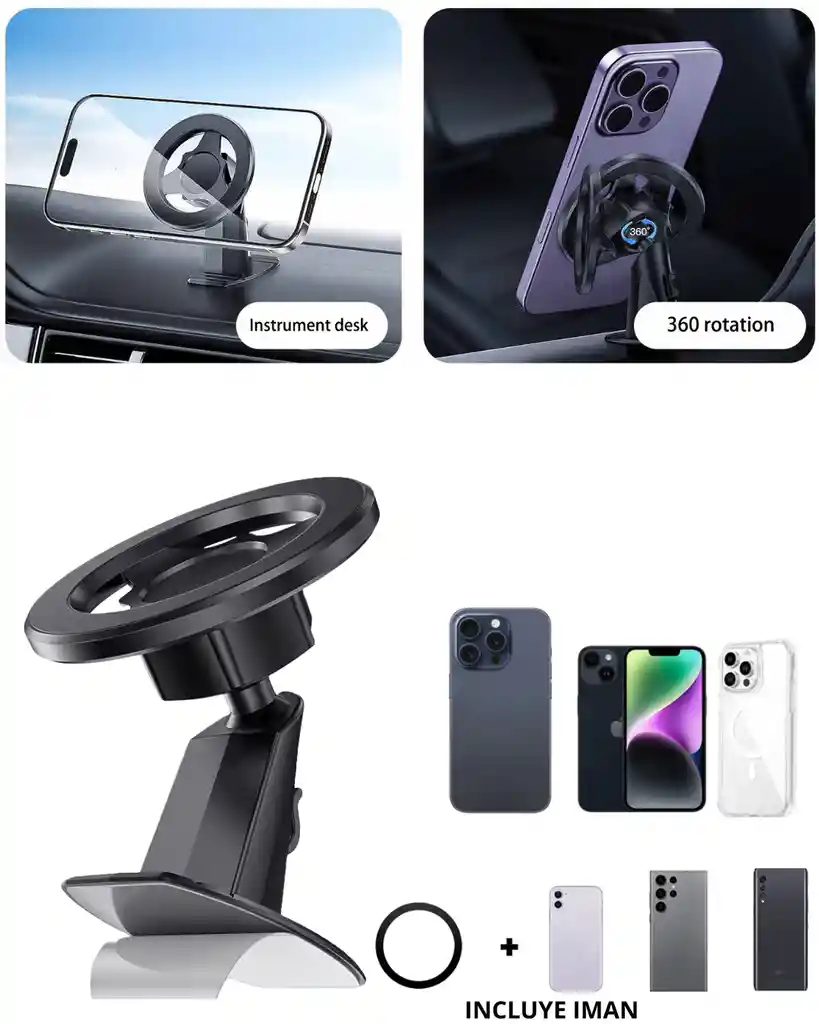 SOPORTE COMPATBLE CON LA SERIE DE IPHONE 15 16 17 LOS DEMAS MODELOS DEBE UTILIZARSE EL METAL INCLUIDO