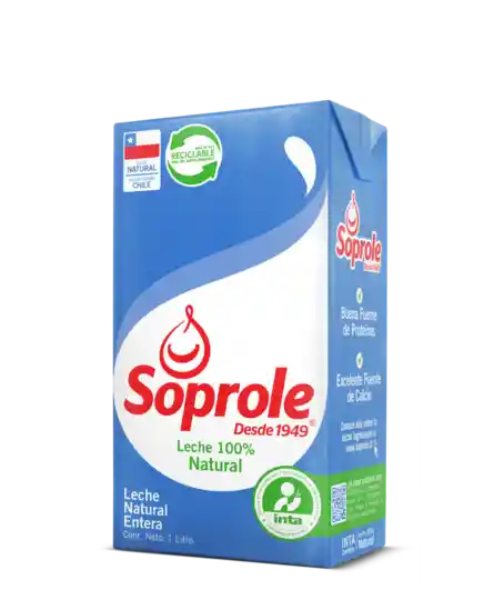 Leche Soprole es pura leche natural no reconstituida, esterilizada bajo proceso de ultra alta temperatura (U.H.T.). packing: Caja