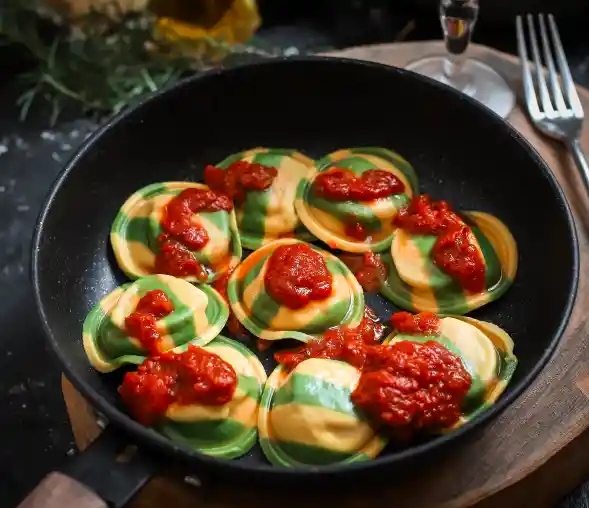 Pasta bibolor hecha a mano con harina italiana, relleno de Costillar de Cerdo al horno hecho con mostaza y miel. Modo de Preparación: Colocar la pasta rellena congelada en un olla con abundante agua hirviendo con sal. Flota la pasta y esperar sólo 3 min. Retirar con espumadera y servir. PRODUCTO CONGELADO