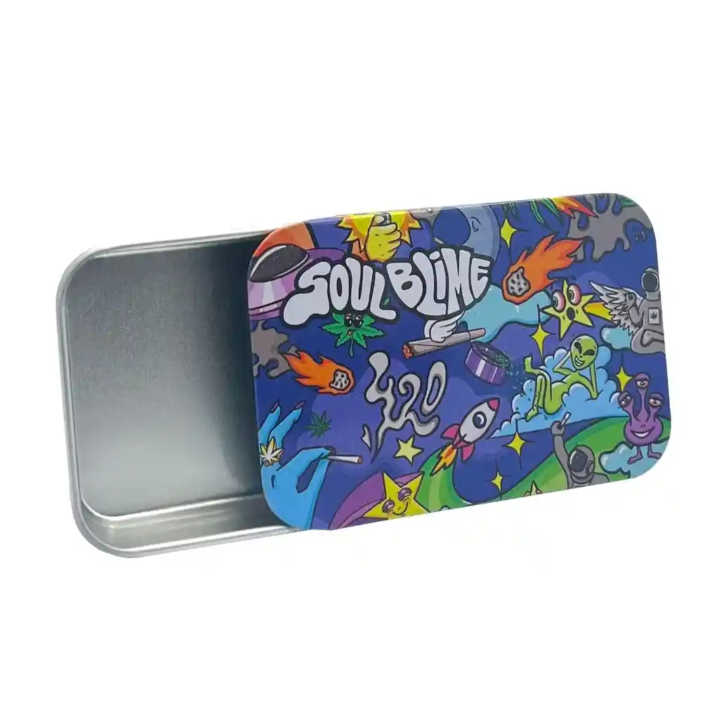 Contenedor deslizante Soulblime tamaño pequeño, compacto y liviano. Presenta diseños ilustrados característicos de la marca. Apertura práctica deslizante, no hermético. Ideal para organizar y transportar accesorios diarios con estilo urbano. No es hermética.
