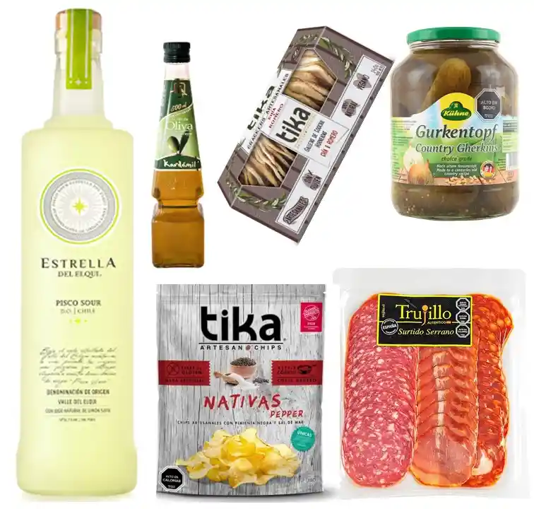 *Pisco Sour Estrella del Elqui 750 cc *Surtido Serrano *Papas Fritas Artesanales *Galletas Crackers Artesanales *Pepinillos Especiales Gurkentopf *Aceite de Oliva