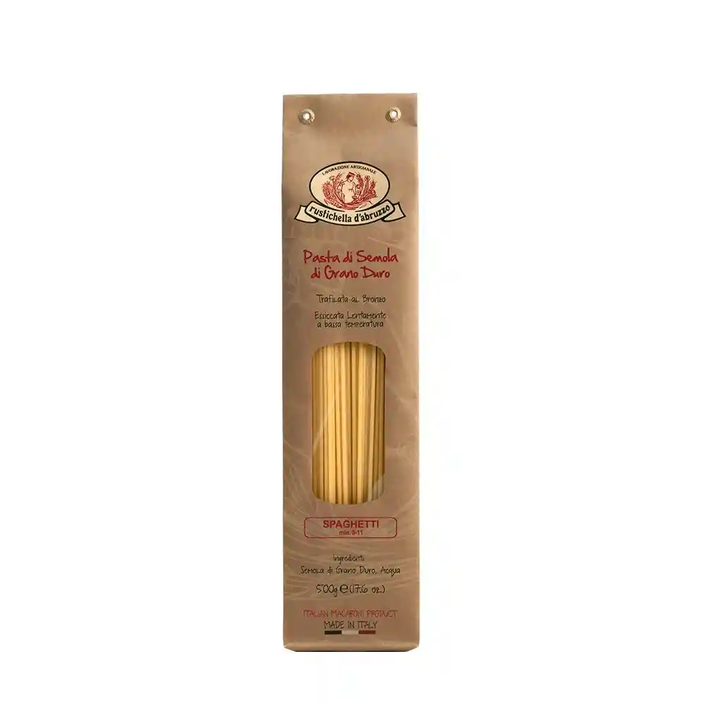 Pasta larga redonda y delgada. Elaborada con sémola de trigo duro amasada con agua de montaña y moldeada en bronce para una particular aspereza, secadas lentamente entre 40 y 60 horas. Hecho en Italia.
