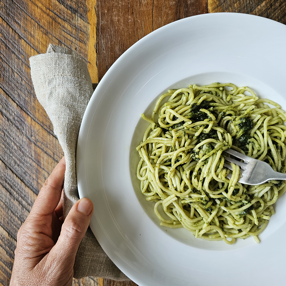 <p>Un plato simple pero que no falla! spaguetti con pesto suave y parmesano!</p><p>400 gr bruto.</p><p>Solo debes calentar en el microondas 5 min y listo!</p><p>Pincha con el tenedor el film transparente que lo cubre y lo metes tal cual al microondas 5 min y listo! </p><p>Los platos llegarán congelados para que puedas contar con ellos cuando lo necesites y al calentarlos estar'an como recien salidos del horno y 100%naturales.</p><p>Bandejitas especiales para calentar en microondas, no olvides reciclarlas!</p><p> </p><p> </p>