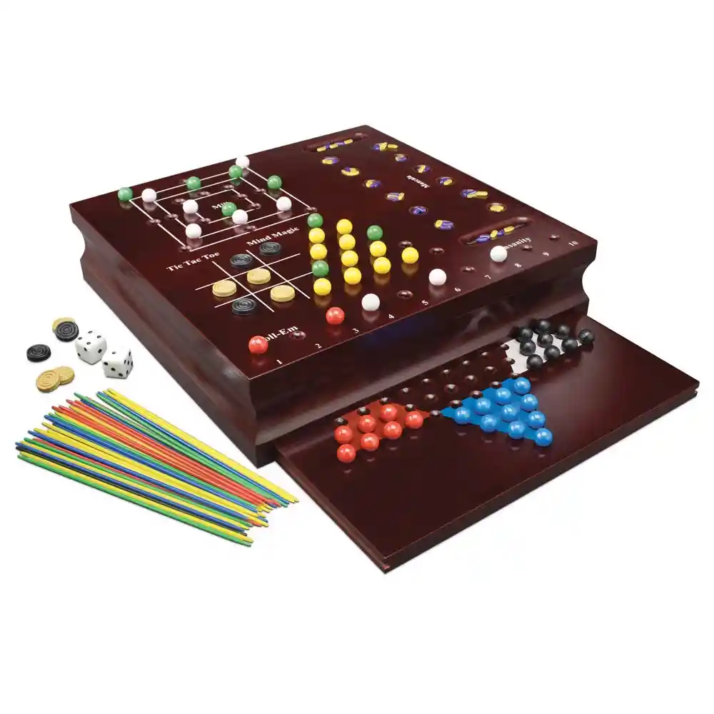 Ahora puedes tener 10 juegos clásicos en uno. Todos los juegos son tableros de madera maciza e incluyen ajedrez, borradores, backgammon, damas chinas, mancala, locura, molino, ceros y cruces, recoger palos, rodar y pensar en la magia. El juego fomenta Interacción social, resolución de problemas, desarrollo de habilidades: reglas, compartir, tomar turnos. Maravillosamente empaquetado, y antes de que te des cuenta, estará en tu casa y recibirá comentarios de admiración de toda tu familia, amigos y colegas. Se recomienda de 6 años en adelante.