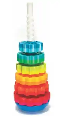 Deje caer los discos vibrantes en el poste roscado del sacacorchos y sorpréndase mientras giran rápido y suavemente para asentarse en la base reversible. Elegir cómo colocar la base es la mitad de la diversión para su niño. Elija la base oscilante o dele la vuelta para obtener un asiento sólido. Cada disco es de dos colores y, de mayor a menor, forman un arco iris dinámico que utiliza tonos divertidos como magenta, lima y verde azulado, y sus tonos más tradicionales de limón, rojo y azul cielo. Los discos en forma de estrella también alternan entre el estilo de margarita y las formas de explosión de estrellas. Hechos de plástico recubierto que es agradable al tacto, los discos son sólidos y no contienen BPA.
