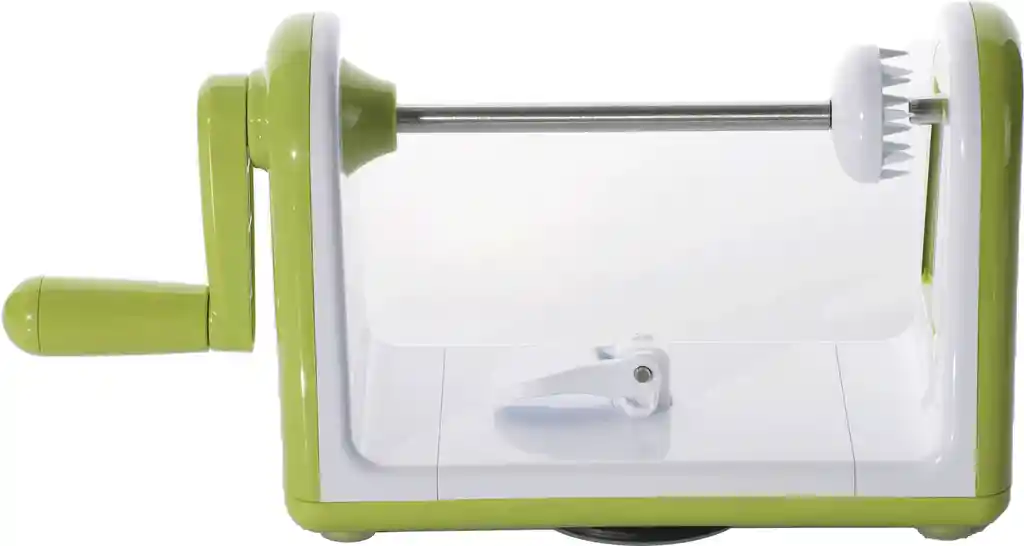 SPIRALCAT PLUS- ESPIRALIZADOR DE VERDURAS Y FRUTAS Con SpiralCat Plus ya no tienes que seleccionar tus verduras por su forma. Ahora podrás obtener espaguetis de zapallo italiano zanahorias papas camote cortar betarragas cebollas manzanas de todo!! Tan solo con unas vueltas a su manivela verás cómo tu espagueti sin gluten sale con una forma perfecta es muy entretenido además para que los más pequeños te puedan acompañar. Precisión estabilidad y calidad Cuerpo montado con cuchilla plana cabeza y varilla sostenedora de alimento libre de BPA 5 cuchillas para diferentes cortes de acero inoxidable recipiente para recibir el alimento la ventosa de goma en la base la adhiere en la superficie y proporciona mayor estabilidad.