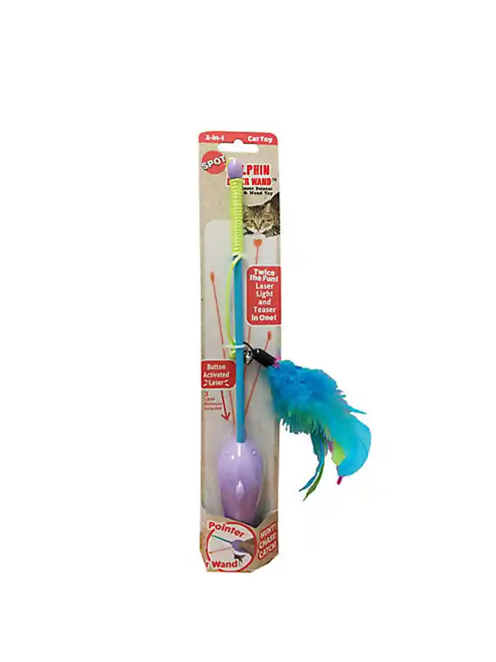 Dale a tu bebé peludo el doble de diversión con el juguete para gatos Ethical Pet Dolphin Laser Wand. Este maravilloso juguete combinado presenta una pluma que revolotea en una varita teaser Y una luz láser. ¡Tu gatito no creerá lo que ve cuando saques este juguete! Un botón en el lindo mango con forma de ratón te permite activar el láser cuando lo desees. ¡Incluso hay una pequeña campana para divertirse mientras juegas! La divertida varita teaser tiene un juguete de plumas revoloteando para atraer a tu gato a jugar. Una campana trae diversión ruidosa a las sesiones de juego. Una luz láser lleva el juego a otro nivel. Activa el láser con el botón del mango con forma de ratón. Viene con baterías para alimentar el láser.