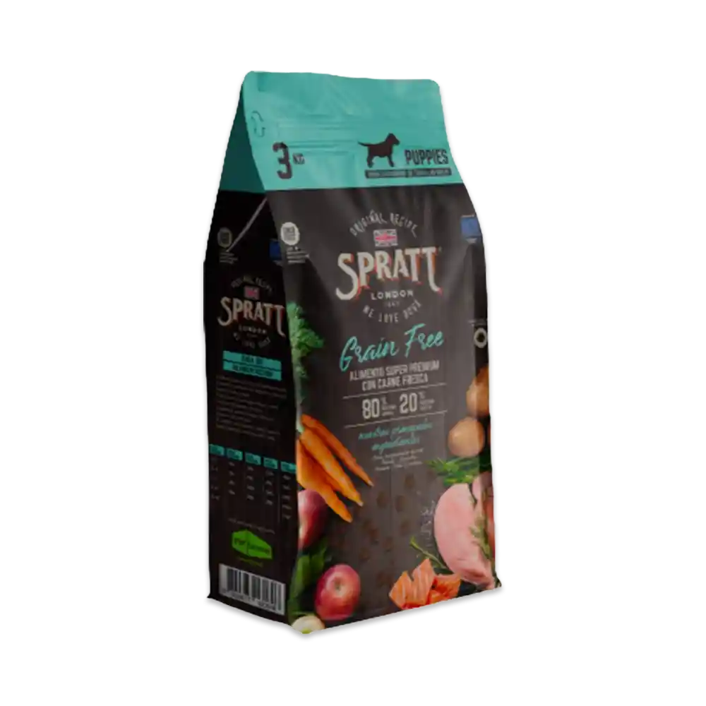 Con Spratt tu perro alcanza una excelente condición ya que aporta los nutrientes (proteínas de alta digestibilidad y valor biológico, ácidos grasos esenciales tipo Omega-3, hidratos de carbono, fibra, vitaminas y minerales esenciales necesarios) para alcanzar un óptimo estado de fisiológico, de actividad, longevidad y vitalidad. Este alimento es Grain Free con carne fresca Posee 80% proteína animal y 20% proteína vegetal. INGREDIENTES Proteína de pollo deshidratada (15% de pollo fresco), patata, legumbres, grasa de pollo, levadura, proteína de pescado, hígado de pollo hidrolizado, aceite de pescado, complejo de frutas y verduras, sustancias minerales, fibra de manzana, yucca schidigera, glucosamina, sulfato de condroitina, Manano-oligo sacharides (MOS), Fructo-oligo sacharides (FOS), taurina, antioxidantes naturales. ANÁLISIS DE LOS COMPONENTES Proteína cruda 31% grasa cruda 18%: fibra cruda 1.5% ceniza cruda 7%, calcio 1.3% fósforo 1.1% energía metabolizable kcal/kg