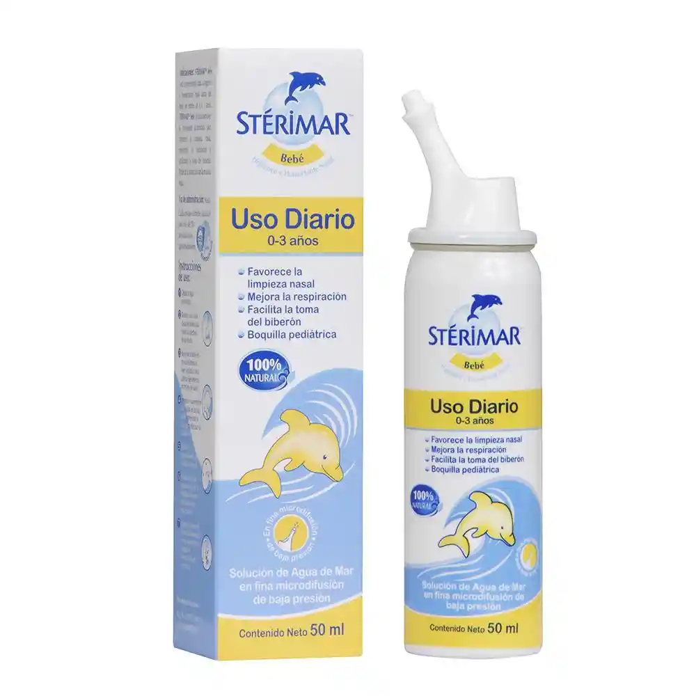 Mantener la nariz de tu bebé despejada es fundamental para que pueda respirar bien y tener un buen sueño. El Spray higiénico nasal Sterimar Bebé es una solución isotónica de uso diario 100% natural para la higiene y humectación nasal del bebé en edades de 0 a 3 años. Cualidades: Limpia y humecta de manera natural los conductos nasales para favorecer una mejor respiración. Ayuda a remover la mucosidad acumulada para favorecer la limpieza nasal. Mejora la respiración del bebé facilitando la toma del biberón. Refuerza la protección de la mucosa nasal. Boquilla pediátrica adaptada a la nariz pequeña de tu bebé. Funciona en cualquier posición: cómodo y seguro. Microdifusor suave y continuo que no lo asustará.