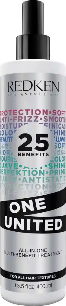 Tratamiento One United 25 Beneficios Redken Tratamiento capilar multibeneficios en spray con 25 características que aumentan la manejabilidad, la protección y la belleza. ¿Qué hace? - Sus características de cuidado aumentan la manejabilidad, la protección y la belleza - Proporciona un acondicionamiento ligero - Mejora las propiedades de cuidado de otros tratamientos sin enjuague - Suaviza la textura de los productos de peinado - Acondiciona y nutre el cabello - Mejora incluso el cabello poroso - Desenreda, fortalece y reduce la resequedad del cabello - Prepara el cabello para el peinado y ayuda a prevenir el quiebre debido al cepillado - Apto para cabellos tratados con color y mechas ombré - Ayuda a prevenir los daños provocados por el calor de las herramientas de peinado - Ayuda a prevenir las puntas abiertas y sella la cutícula capilar - Ayuda a proteger el cabello de las agresiones externas - Le da un toque sedoso al cabello - Aporta suavidad y brillo - Ayuda a controlar el frizz - Elimina la estática - Controla los mechones rebeldes - Facilita el secado con secador - Revitaliza el peinado - Acabado ligero