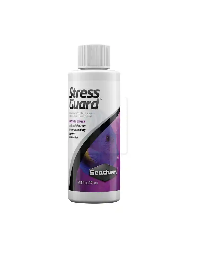 StressGuard ™ es un acondicionador Premium que protege la mucosa de los peces. StressGuard ™ reducirá el estrés y la toxicidad del amonio durante la manipulación o transporte de peces. StressGuard ™ se une a las proteínas expuestas en las posibles heridas sufridas para promover así la curación del pez afectado y reducir la probabilidad de infecciones primarias y secundarias.