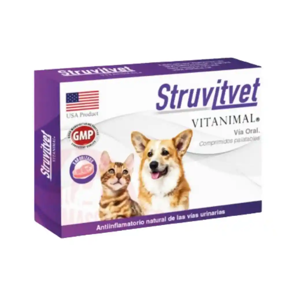 Struvitvet es un suplemento nutricional indicado como coadyuvante en la prevención y disolución de cristales de estruvita, siendo un potente antiinflamatorio natural de las vías urinarias. Especies: Caninos y Felinos. Administración: Vía oral. Ingredientes Activos DL-Metionina…………..………………500mg Concentrado de Cranberry……………250mg Concentrado de Zarzaparrilla………..250mg Concentrado de Chancapiedra………250mg Excipientes Saborizantes Naturales Excipientes C.S.P……………………...1 comprimido Posología: Perro: 1 comprimido por cada 10 kg al día. Gato: 1/4 comprimido al día.