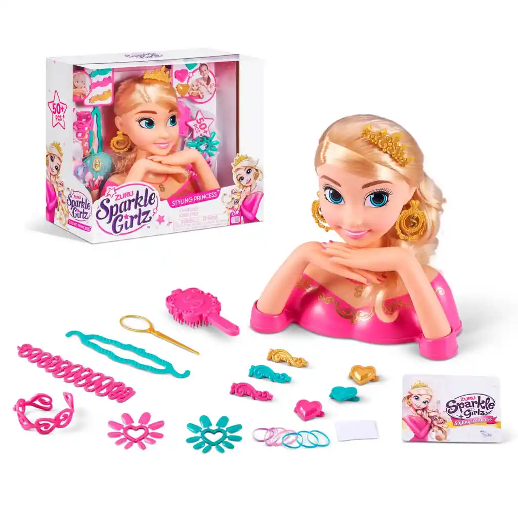 Peina a esta hermosa muñeca una y otra vez, para que siempre luzca como toda una princesa de cuento de hadas. La Styling Head de Sparkle Girlz viene con un hermoso y abundante cabello suave para que lo peines y cepilles con su majestuoso cepillo. Podrás decorarlo con los coloridos accesorios para resaltar aun más su belleza ¡Son miles de estilos que puedes hacer y crear! Este playset incluye 1 cabezal de peinado Sparkle Girlz con cabello enraizado, 1 cepillo, 2 mechas de colores con clip, 2 pinzas decorativas y 10 cintas elásticas para el cabello. Los accesorios también los puedes usar así las dos lucirán como hermosas princesas.