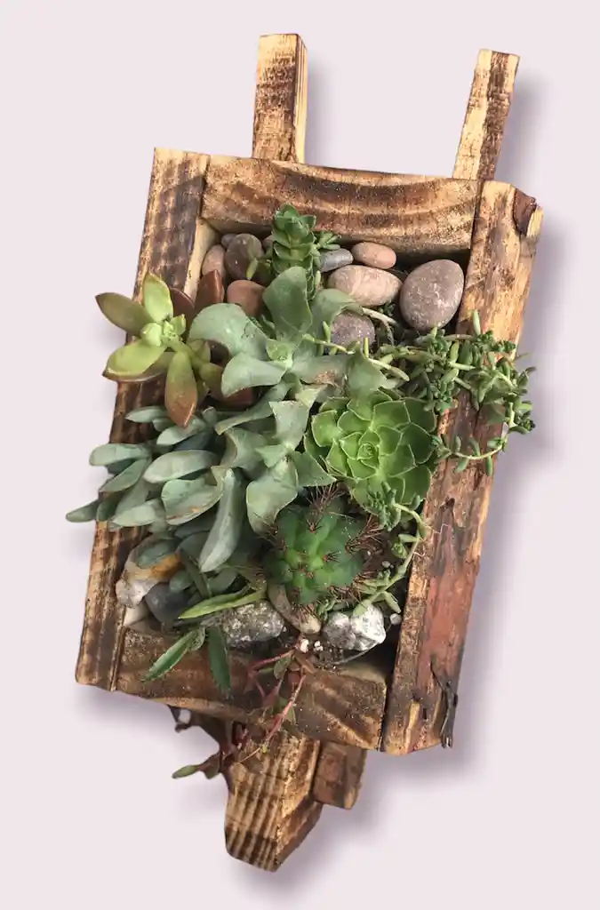 Suculenta Cactus Carretilla Madera piedras naturales 20 x 38,5 cm Ideal para Exterior Modelo único por unidad