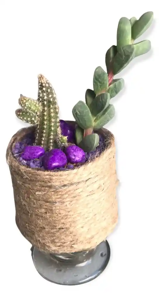Suculenta copa vidrio piedras moradas ideal para decorar exteriores o interiores Modelo único por unidad