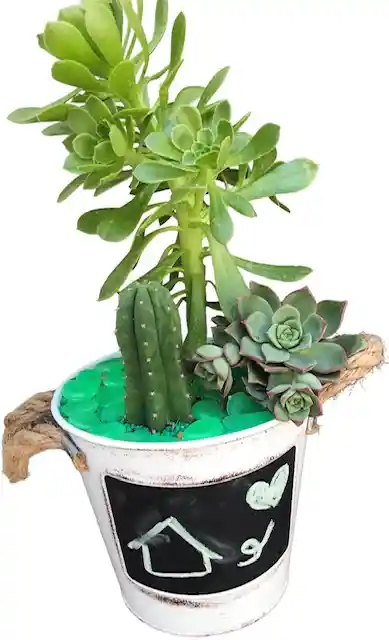 15 x 17 cm Formato Hermosa Suculenta en Maceta de metal con pizarra en exterior para decorar a su gusto ideal para espacios exteriores o interiores Modelo único por unidad