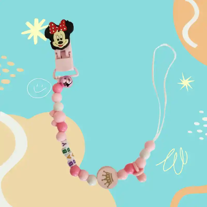 Especificaciones. Material: Cinta + Plástico Color: Rosado Diseño Minnie Contenido: 1 Portachupete. Permite sujetar el chupete a la ropa del bebé y evitar que caiga al suelo y se ensucie Hermoso diseño que atrae la atención del bebé Fácil de limpiar, seguro y cómodo para el bebé.
