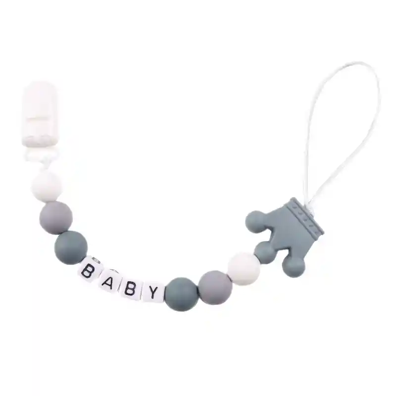 . Material: Silicona. . Dimensiones: 32 cm aprox. . Color: Gris . Contenido: 01 Portachupete. . Bello sujetador que permite mantener el chupete o mordedor al alcance del bebé, evitando que caiga al suelo o se pierda. . Las cuentas de silicona que ayuda al desarrollo táctil y visual del bebé, así mismo pueden ser mordidas, aliviando el dolor de las encías en la etapa de dentición. . El contacto con el sujetador estimula habilidades motoras finas y coordinación ojo-mano al manipular las cuentas. . Tiene un clip seguro que no daña la ropa ni se desprende con facilidad.