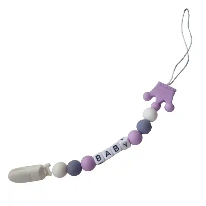 Especificaciones: . Material: Silicona, plástico y cordón. . Dimensiones: 32 cm aprox. . Diseño: Incluye cuentas de colores, atractiva figura en forma de corona y letras que forman la palabra BABY. . Edad recomendada: para bebés desde 0 meses. . Color: Lila . Contenido: 01 Portachupete. . Bello sujetador que permite mantener el chupete o mordedor al alcance del bebé, evitando que caiga al suelo o se pierda. . Las cuentas de silicona que ayuda al desarrollo táctil y visual del bebé, así mismo pueden ser mordidas, aliviando el dolor de las encías en la etapa de dentición. . El contacto con el sujetador estimula habilidades motoras finas y coordinación ojo-mano al manipular las cuentas. . Tiene un clip seguro que no daña la ropa ni se desprende con facilidad.