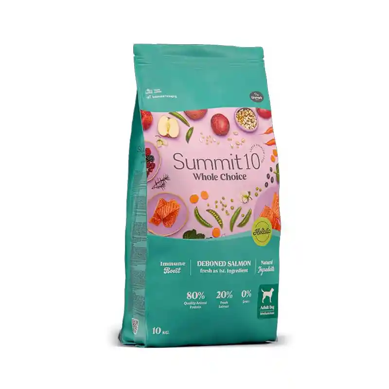 Summit 10 Whole Choice Adult Medium - Salmón es un alimento indicado para perros adultos de raza mediana y grande de mas de 12 meses. El salmón fresco es protagonista de esta receta por su excelente sabor y por ser fuente de ácidos grasos esenciales como el Omega 3 que ayuda al desarrollo de los músculos, del sistema cardiovascular y al mantenimiento saludable de la piel y pelaje. Completa la receta carbohidratos altamente digestibles y una variedad de verduras y frutas como los guisantes, la zanahoria, la manzana y los frutos rojos que aportan vitaminas, minerales, fibra y antioxidantes. Finalmente se añade un mix de hierbas como el romero, la caléndula y el diente de león que enriquecen la dieta y favorecen el bienestar intestinal. 80% Proteína animal. 20% Pollo fresco. 0% Cereales.