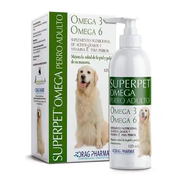 Superpet Omega Perro Adulto, es una mezcla de aceites de origen natural y Vitamina E, especialmente formulado para la mantención de la salud de su perro. Su contenido en ácidos grasos esenciales Omega 6, favorece el crecimiento en animales jóvenes, así como el desarrollo y mantención de una piel y pelaje saludables para su mascota. Los ácidos grasos Omega 3 proporcionan una fuete natural de protección para el funcionamiento del sistema nervios, cardiovascular e inmunológico. Por su actividad antioxidante, ayuda a retardar los procesos de desgaste propios del envejecimiento. Los ácidos grasos esenciales Omega 6 ayudan a la mantención de una piel sana y un pelaje saludable a lo largo de la vida de su mascota, La optima relación de ácidos grasos Omega 6/Omega 3 favorece el metabolismo de su perro. Instrucción de uso: 3 mL por cada 10 Kg de peso (3 bombeos/10 Kg al día ). Administrar mezclado con el alimento o directamente por via oral. Composición: Cada 1 mL contiene: Ácido Linoleico (LA)…………………….439,8 mg Ácido Gama-Linolénico (GLA)…………..9,96 mg Ácido Eicosapentanoico (EPA)…………21,06 mg Ácido Docoxahexanoico (DHA)………..28,91 mg Vitamina E (como Acetato)………………….46 UI Relación omega 6 : omega 3 = 8,6:1 Ingredientes: Aceite de Maravilla, Aceite de Borraja, Aceite de Salmón, DL-Alfa-Tocoferol Acetato (Vitamina E), saborizantes
