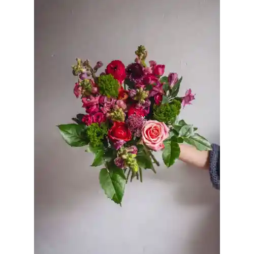 Ramo de flores mix de la estación en tonos rojos, burdeos y rosados especial para este san valentín, día del amor y la amistad.