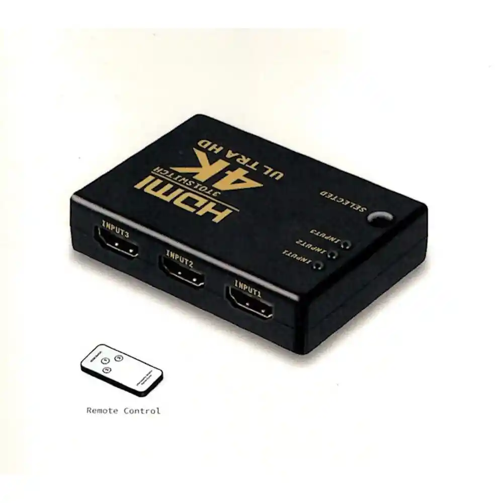 El Switch HDMI le permitirá crear la conexión desde 3 fuentes de video distintas ya sea computador Blue-Ray o consolas de videojuego a una sola entrada HDMI en el televisor pantalla o proyector. Su resolución máxima es de Full HD 1080p y su fuente de alimentación es extraída desde el mismo HDMI. (En caso de que los cables de conexión sean muy largos o los dispositivos no emitan potencia desde su puerto podría necesitar de un transformador 5v para energizarlo). Incluye control remoto infrarrojo.