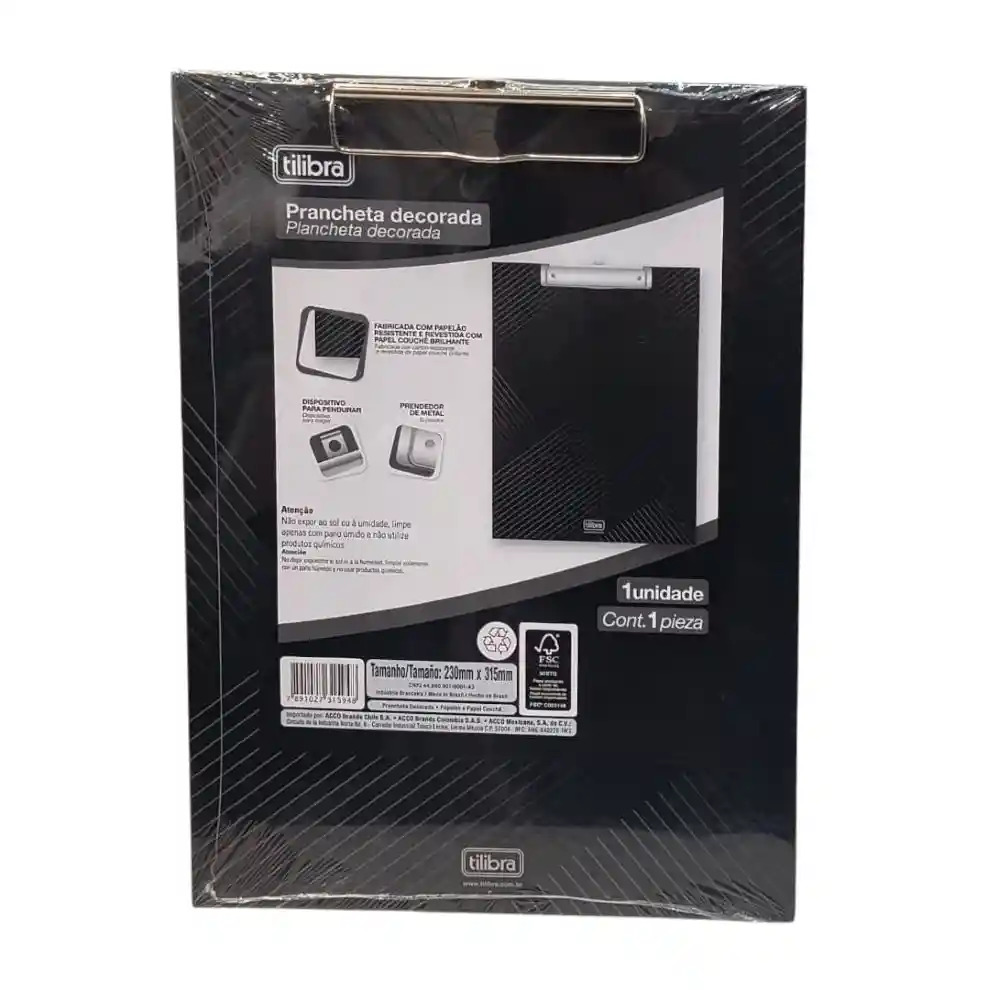 Tabla apretapapel (Portapapel) Tilibra medidas 230 mm x 315 mm, sujetador de metal, fabricado en carton resistente y revestida en papel couche, no dejar expuesta al sol ni a la humedad, no usa productos quimicos