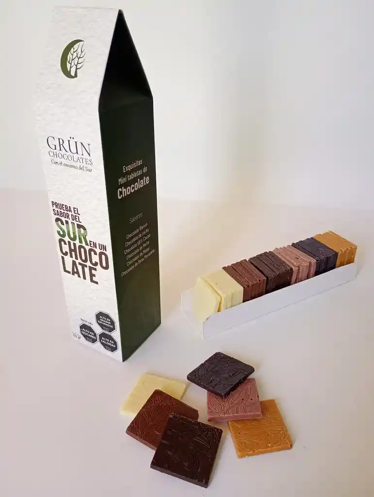Chocolates en Formato mini tabletitas 6 Sabores : Murta, Maqui, Rosa Mosqueta, Negro 56% cacao, Leche y Blanco.