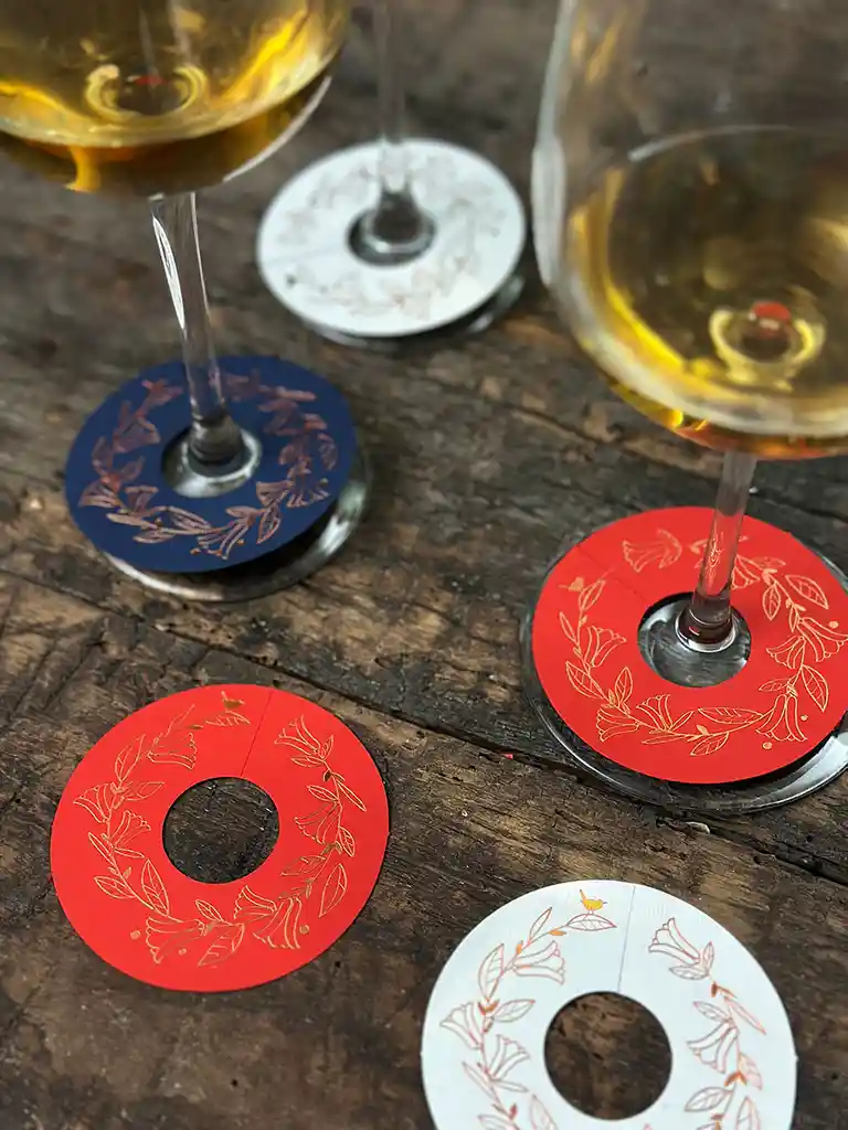 Tags de papel para colocar en la base de las copas. 12 Unidades 7.5 cm .diámetro Permite decorarlas e identificarlas Hechos en papel rojo, azul y blanco Impresión en folia cobre