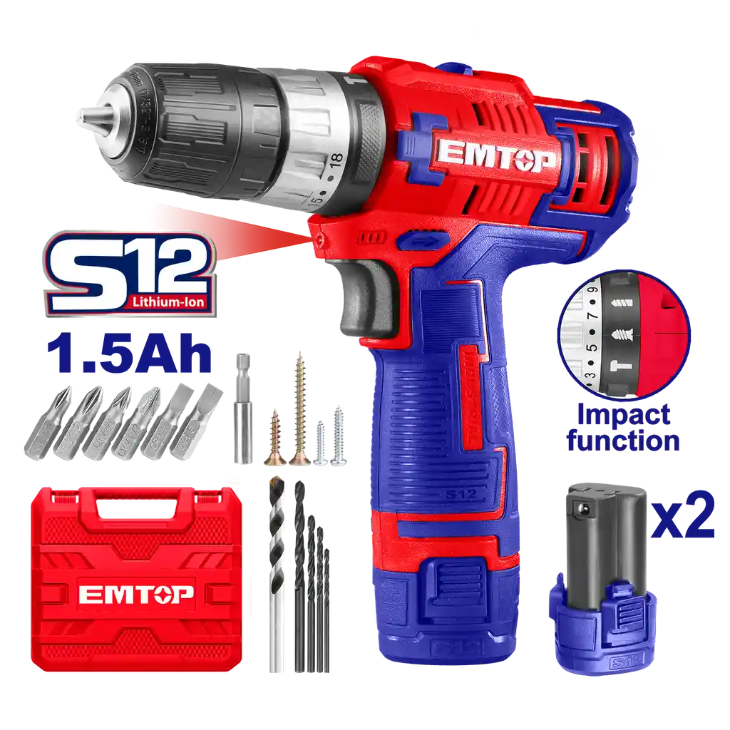 Voltaje: 12V velocidad sin carga: 0-400 / 0-1500 / min tasa Max.impact: 22500 / min Max.torque: 20nm capacidad de Chuck: 0.8-10mm Par de apriete: 15 + 1 Mecánica de engranajes de 2 velocidades Voltios de carga: 220V-240V ~ 50 / 60Hz Luz de trabajo integrada Con 2pcs 1.5Ah batería Con el cargador 1pcs Con los accesorios 50pcs Embalado por la caja plástica
