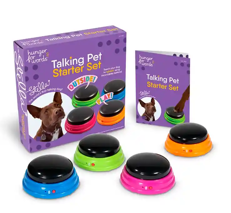 El juguete interactivo Talking Pet Starter Set está diseñado para que tu perrito pueda expresarse de una forma más fácil, ya que incluye 4 botones, cada uno puede funcionar para una palabra en específico, además pueden grabar su propia voz, para que así a tu mascota se haga super fácil el poder reconocerte. El set de iniciación para mascotas Hunger For Words Talking. Este kit, un práctico dispositivo para su peludo amigo, cuenta con 4 botones de habla grabables en los que puede grabar y enseñar palabras como fuera, cama, jugar y mucho más. También incluye una sencilla guía para ayudarle a realizar las actividades sin esfuerzo.