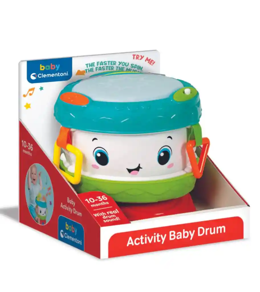 El alegre Baby Tambor de Clementoni es totalmente interactivo y cuenta con numerosas melodías, sonidos y efectos luminosos que irán al ritmo de la música. Tu pequeño puede tocarlo como si fuera un verdadero tambor, hacerlo girar para acelerar la música o jugar con los colgantes. Sólo pulsando el botón del marco del tambor, tu bebé podrá escuchar gran cantidad de sonidos y divertidas melodías. Al tocar la parte superior del tambor, podrán escuchar gran variedad de tipos diferentes de percusiones y divertidos sonidos. La velocidad de la música cambia en función de la rotación del tambor creando divertidos efectos de luz y sonido. ¡Un tambor rebosante de actividades y divertidas melodías para descubrir la música y el sentido del ritmo! Sus llamativos efectos de las luces atraerán la atención del niño y despertarán su curiosidad mientras juega. Características: Pulsando el botón del marco del tambor, el niño podrá escuchar gran cantidad de sonidos y divertidas melodías. Al tocar la parte superior del tambor, el niño puede escuchar gran variedad de tipos diferentes de percusiones y divertidos sonidos. La velocidad de la música cambia en función de la rotación del tambor creando efectos de luz y sonido. Los efectos de las luces atraerán la atención del niño y despertaran su curiosidad mientras juega. Cuenta con una ventosa en la base del tambor, la cual permite mantener el juguete estable incluso mientras gira.