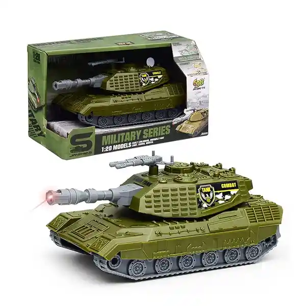 Mecanismo inercial de movimiento. Los sonidos de movimiento, disparos, iluminación roja del cañón. La luz y el sonido funcionan con 3 pilas AG13 (incluidas). La torre se puede girar 360 grados hacia la derecha y hacia la izquierda. Dimensiones del tanque: 19 x 9 x 8 cm. Material: plástico. Para niños a partir de 3 años. Cumple con los requisitos de seguridad del producto