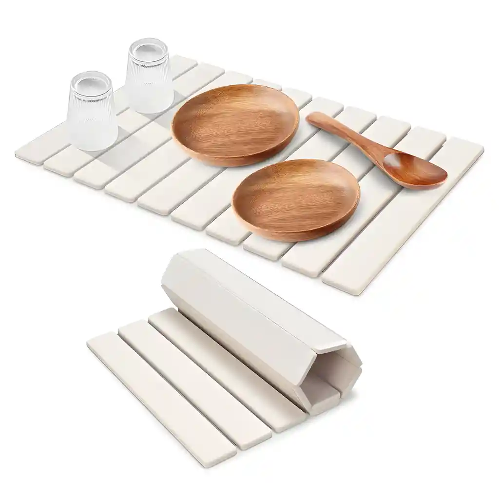 Tapetes Escurridor Loza Absorbente Colores Plegable Diatomita 30X40CM Este práctico escurridor de lozas, absorbente especialmente diseñada para secar utensilios de cocina. Está hecho de diatomita, un material natural con asombrosa capacidad de absorción y secado rápido. Absorción ultra rápida: la diatomita puede absorber hasta un 150 % o más de su propio peso en agua y evaporarla en minutos, manteniendo la superficie completamente seca y libre de charcos. Ideal para platos, vasos y cubiertos recién lavados. Higiénico y antimicrobiano: su estructura porosa no solo secará rápidamente sino que también inhibe el crecimiento de bacterias y malos olores en áreas húmedas. Eco‑friendly y elegante: producto sostenible y biodegradable; su acabado tipo piedra pulida aporta un toque sobrio y moderno a cualquier cocina. Limpieza sencilla: basta con enjuagar con agua o limpiar con un paño húmedo. Para manchas leves, puedes lijar suavemente la superficie con lija de grano fino; para manchas más intensas, aplicar peróxido o blanqueador diluido cuidadosamente. Evita deformaciones: no lo dejes saturado continuamente. Es recomendable elevarlo ligeramente (usa unos pies o el soporte) y permitir que se seque completamente entre usos para prevenir warping o curvatura de los bordes. Especificaciones: Colores Disponibles: Blanco. Dimensiones: 30X40 CM Material: Diatomita Uso: Escurrir loza Paquete contiene: 1 Tapete Blanco