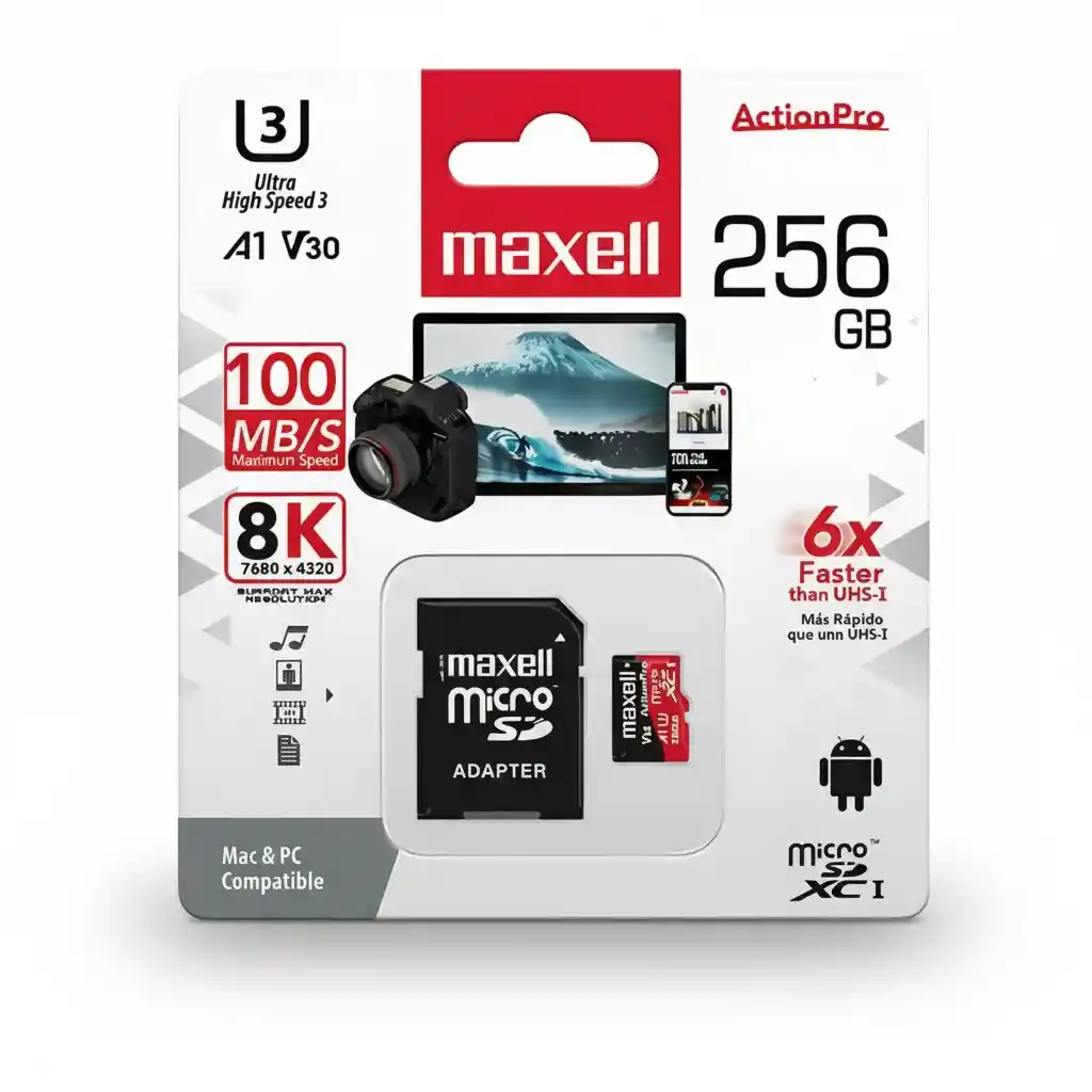 Tarjeta MicroSD Maxell 256GB UHS-3 ACTION PRO 8K 100MB/s – Rendimiento extremo y máxima velocidad La Tarjeta MicroSD Maxell ACTION PRO 256GB UHS-3 está diseñada para quienes exigen rendimiento profesional en grabación, fotografía y transferencia de datos. Con velocidad de lectura de hasta 100MB/s y clasificación UHS Speed Class U3 / Class 10, es perfecta para grabaciones en resolución 4K y 8K ultra HD, sin cortes ni interrupciones. Confía en Maxell ACTION PRO para capturar tus momentos más intensos con precisión, velocidad y seguridad profesional. Perfecta para cámaras deportivas, drones, smartphones y equipos de grabación de alto rendimiento. Características destacadas: Velocidad superior: Hasta 6 veces más rápida que una tarjeta UHS-1, ideal para cámaras 4K y 8K, drones y GoPro. UHS-3 / Class 10: Rendimiento garantizado para video ultra HD fluido y fotografía continua. Capacidad de 256GB: Espacio suficiente para miles de fotos o varias horas de video 4K/8K. Incluye adaptador SD: Compatible con cámaras, notebooks, smartphones, tablets y consolas. Máxima resistencia: A prueba de agua, golpes, rayos X, temperaturas extremas y polvo, ideal para condiciones exigentes. Modelo: MCSD-256U3 Capacidad: 256GB Formato: MicroSD Adaptador SD incluido Marca: Maxell SKU Tecnocenter: 8455