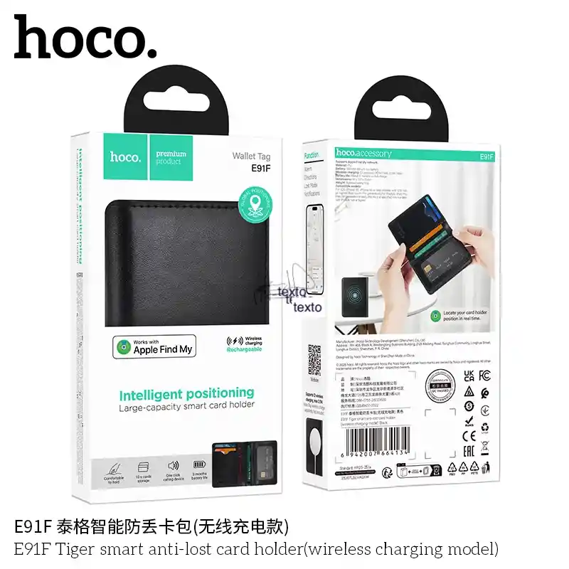 Tarjetero inteligente antipérdida Tiger Hoco E91F (modelo de carga inalámbrica). Compatibilidad con Buscar mi red de Apple Material: PU Dimensiones: 80 x 107 x 26 mm; Peso: 53 g Capacidad de la batería: 100 mAh/batería de iones de litio; Duración de la batería: 3 meses. Dispositivos compatibles: iOS 14.5 o posterior en iPhone SE, iPhone 6s o posterior, o iPod touch (séptima generación) con iPadOS 14.5 o posterior en iPad Pro, iPad (quinta generación o posterior), iPad Air 2 o posterior, iPad mini 4 o posterior
