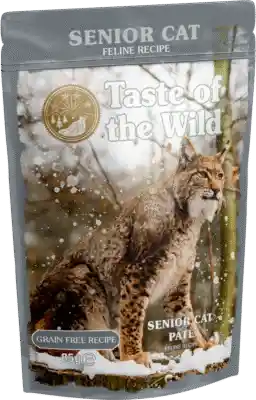 Taste of the Wild Paté Natural para Gatos Senior – Alimento Húmedo Completo sin Granos (85g) Taste of the Wild Senior es un alimento húmedo completo para gatos mayores de 10 años, elaborado sin granos y 100 % natural. Diseñado para satisfacer las necesidades nutricionales en la etapa senior, esta receta de alta digestibilidad entrega energía, vitalidad y soporte a la salud general de tu felino. Con taurina: aminoácido esencial para mantener un corazón sano y una buena visión en gatos mayores. Aceite de girasol y salmón: fuentes naturales de omega-3 y omega-6, ideales para una piel saludable y un pelaje brillante. Inulina: fibra prebiótica que favorece una digestión equilibrada y una flora intestinal sana. Vitaminas y minerales añadidos: refuerzan el sistema inmune, protegen las articulaciones y ayudan a conservar la energía diaria. ✅ Especial para gatos senior (mayores de 10 años) ✅ Sin cereales, sin colorantes ni sabores artificiales ✅ Textura paté suave y palatable, ideal para gatos mayores