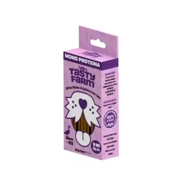 Cajita de Salchichas Monoproteicas de Pato – Tasty Farm (10 unidades) ¡Un snack natural, sabroso y práctico para premiar a tu peludo! Las salchichas monoproteicas de pato de Tasty Farm vienen en un entretenido formato de cajita con 10 unidades, perfectas para dar como premio diario o utilizar en entrenamientos. ⭐ Características destacadas: 100% monoproteica: Elaboradas únicamente con carne de pato, ideales para perros con alergias o intolerancias a otras proteínas. Textura firme y apetitosa: Facilita su manipulación y permite que el perro la mastique adecuadamente. Formato práctico: 10 unidades individuales, fáciles de dosificar y llevar en paseos o viajes. Natural y saludable: Sin colorantes, saborizantes ni conservantes artificiales. 📦 Presentación: Contenido: 10 salchichas en caja. Peso aprox. por unidad: 15 g. Marca: Tasty Farm. Sabor: Pato.