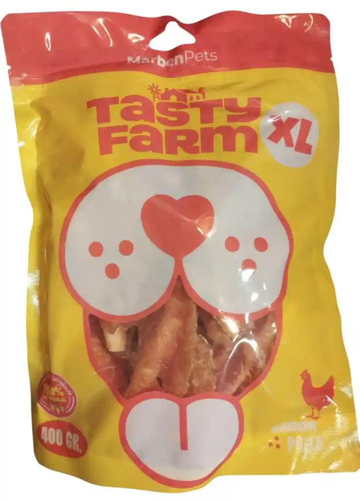 Snack para Perros Tasty Farm Pechuga de Pollo en Carnaza 400 GR Consiente a tu perro con el delicioso snack Tasty Farm Pechuga de Pollo en Carnaza, elaborado con ingredientes 100% naturales y diseñado para mantener a tu mascota feliz y saludable. Este premio combina pechuga de pollo de alta calidad con un palito de carnaza irresistible, ideal para satisfacer el instinto natural de masticación y fortalecer la salud dental. Este snack para perro es alto en proteínas, libre de colorantes y preservantes artificiales, y perfecto como recompensa diaria o para complementar una alimentación equilibrada. FORMATO 400 GR. ✅ Pechuga de pollo natural + carnaza ✅ Fortalece dientes y encías ✅ Alto en proteínas, bajo en grasa ✅ Apto para perros de todas las razas y tamaños ✅ Sin aditivos artificiales