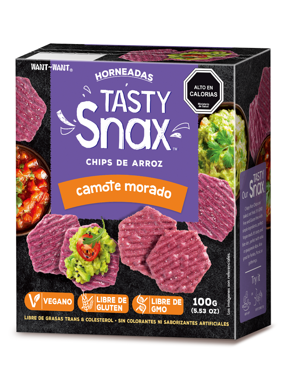 Chips de arroz sabor Camote morado 100gr. Su exquisito sabor y crujiente textura son ideales para disfrutar un rico snack o compartir un aperitivo con tus amig@s. Libres de Gluten y de GMO, Producto Vegano. Horneadas, Libres de Grasas Trans, 0% Colesterol y sin colorantes ni saborizantes artificiales.
