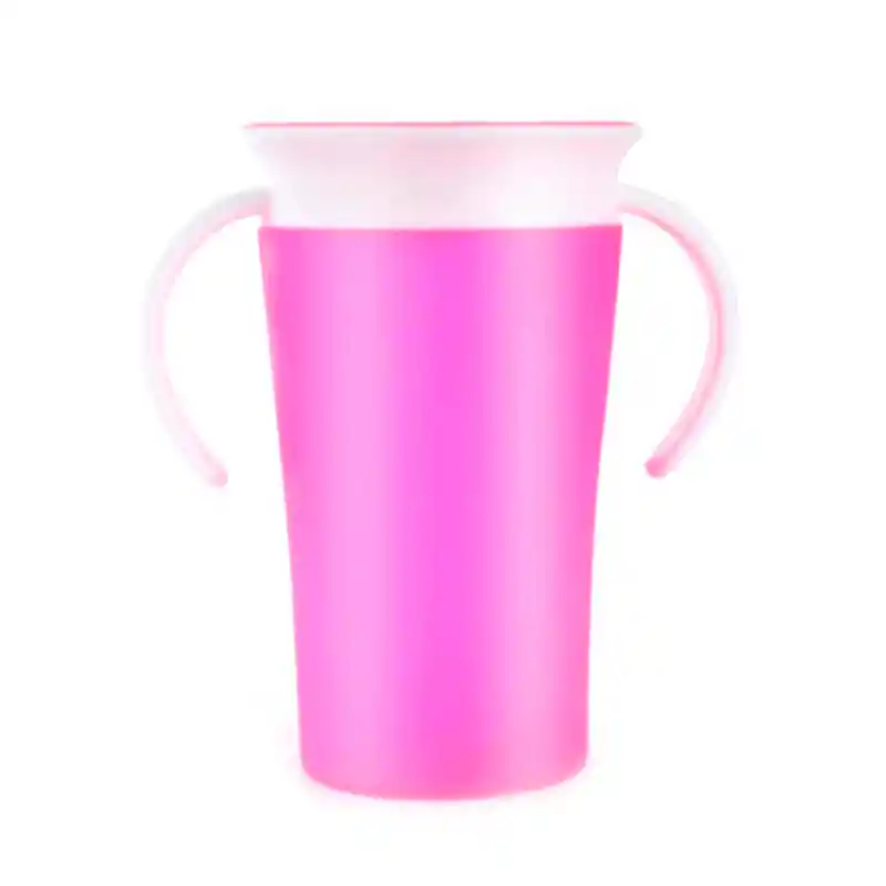 Material: PVC libre de biopolimeros + silicona libre de BPA. Color: Rosa Tamaño: 13 cm X 8 CM aprox. Contenido: 1 Vaso Antiderrame. El diseño del vaso permite tomar líquidos por todo el borde sin derrames. El vaso posee asas que permiten que sea fácil de manipular por el niño. Vaso de entrenamiento recomendado por dentistas.
