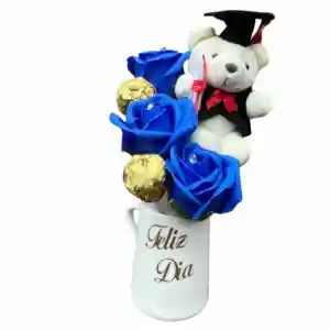 Taza con 3 Rosas Azules, 2 Bombones y Peluchito de Graduación