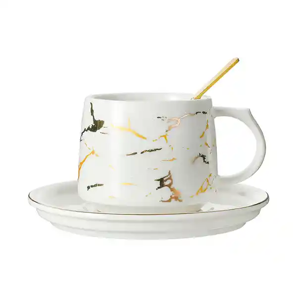 Taza de Cerámica Con Cuchara y Plato. Cerámica Color Blanco. Capacidad 215 ml.