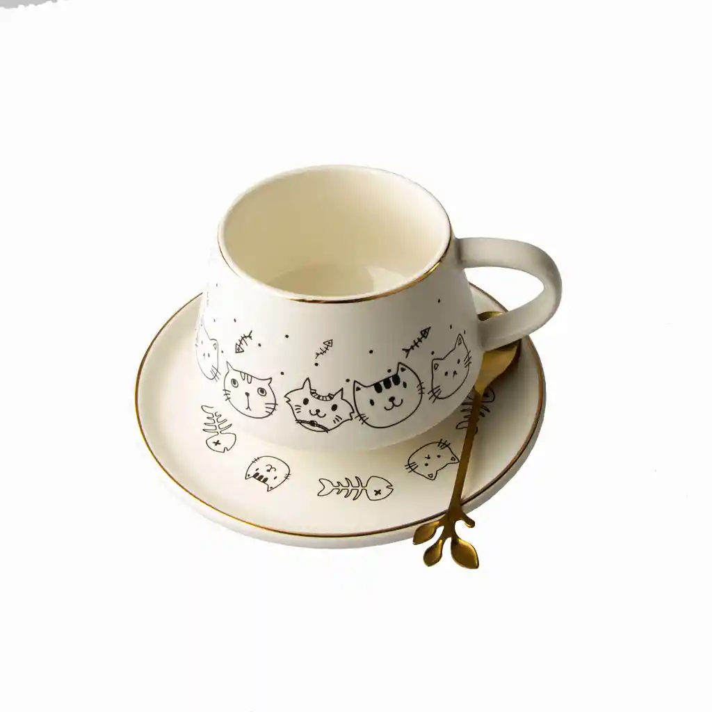 Tazas de cerámica diseño gatos elegante con platito y cuchara! Estas tazas de cerámica será ideal para regalar y coleccionarlas en tu variedad de tazas! Podrás disfrutar de tu té divertidamente. Disponibles en 4 modelos. Material: Cerámica. Capacidad: 320ml Medidas de la taza: Alto: 7cm Profundidad: 7.3cm Largo: 12.5cm Medidas del plato: Alto: 1cm Profundidad: 14.2cm Largo: 14.2cm
