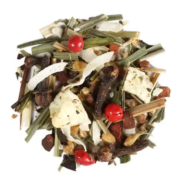 Ingredientes té Blanco Jengibre Lemongrass Canela Trozos de Piña Clavo de Olor Coco Deshidratado Cardamomo Pimienta Roja Trozos de Manzana Esencia Natural de Especias y Canela.