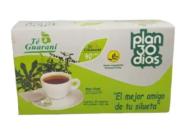 TE GUARANI PLAN 30 DIAS 30 sobres El plan de 30 días habitualmente utilizado como coadyuvante en el control de peso. Casos de estreñimiento y tratamientos para adelgazar No se recomienda su uso durante el embarazo, lactancia, obstrucción de vías biliares, estados inflamatorios intestinales y hemorroides.